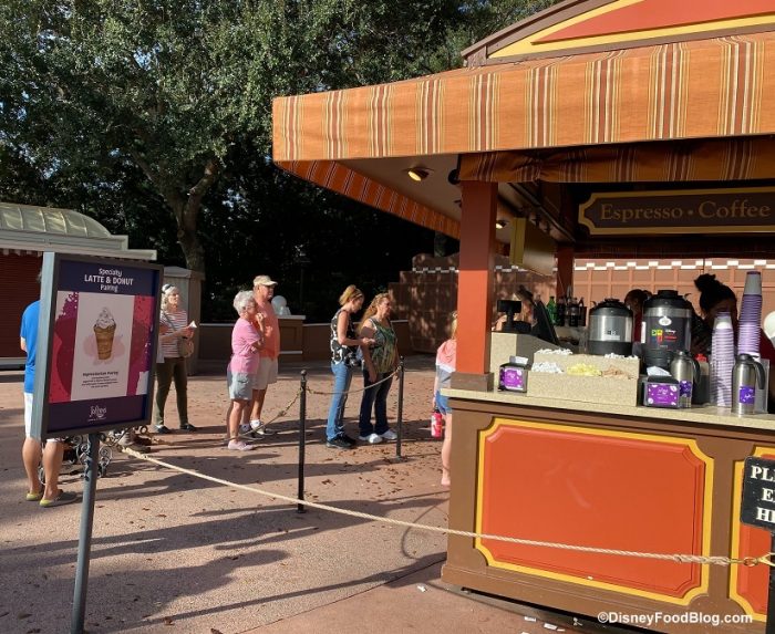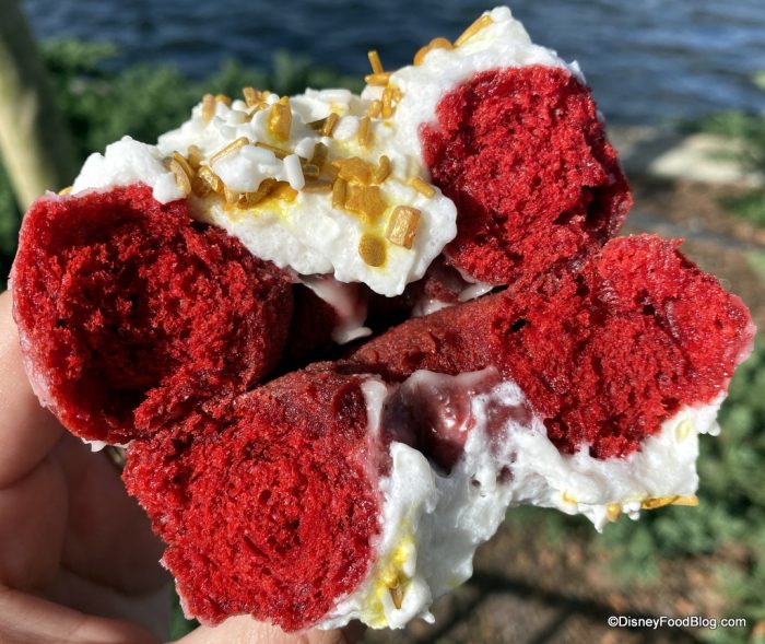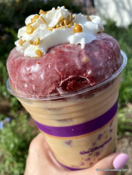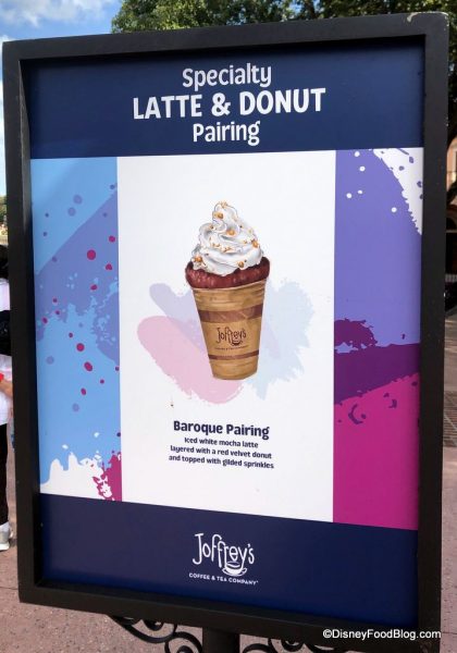 - The American Adventure: Baroque Pairing: White Mocha Iced Latte layered with a Red Velvet Donut and Sprinkles – $9.50