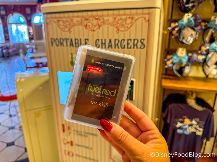 FuelRods are portable chargers for your electronics. They can be purchased at kiosks around Disney World, and a fully charged FuelRod comes in a full kit, which also includes charging cables for various iPhones, micro USB Android devices, and a USB-C Adapter (needed for some Android devices).