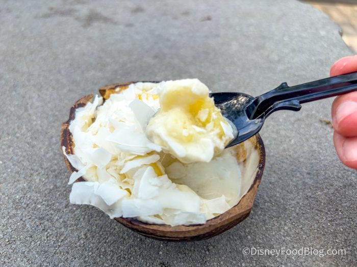 The sorbet has a strong pineapple flavor, with the majority of the coconut flavor coming through in the flakes on top. We loved the chunks of candied pineapple mixed into the sorbet, and it reminded us of DOLE Whip but with an icier texture.