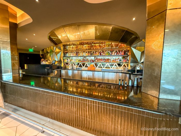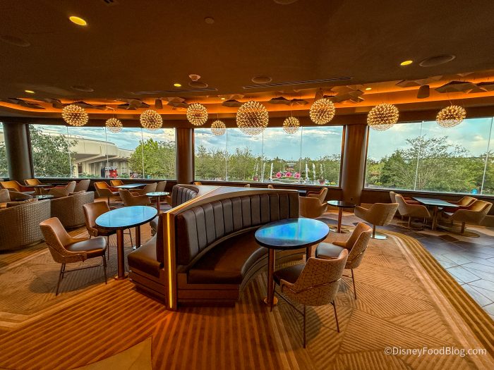 This space certainly does remind us of Spaceship Earth, so we say it gets 5/5 stars for that decoration choice! The main seating area of this space has plenty of comfortable chairs and booths, and it pairs fantastically with all the gorgeous lighting.