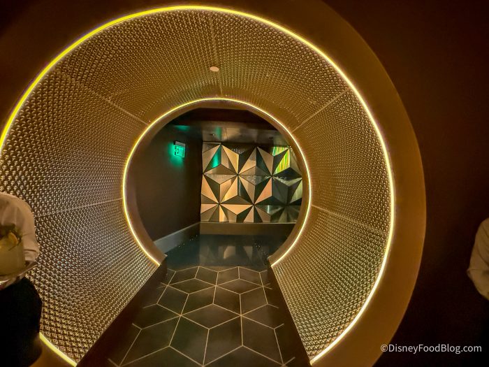 The lounge was announced as a sleek space inspired by “the stories, shapes, and enduring legacy” of Spaceship Earth. It will feature geometric shapes, rich textures, and warm metallic tones to offer a relaxing space for guests. You can find Geo-82 near the back of the Spaceship Earth attraction. Without further ado, let’s take a look inside GEO-82!