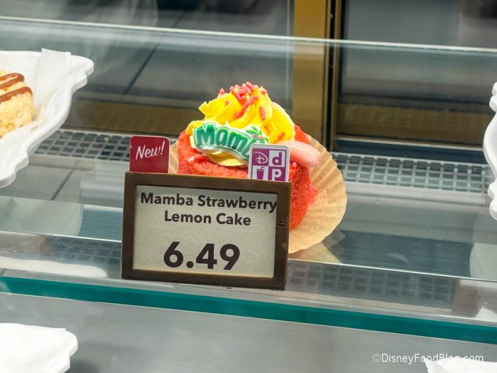 You can now get your choice of two Mamba Cakes at Karamell-Küche. Okay, so maybe you’re wondering why there’s a non-caramel treat here. Well, Mamba is a candy made in Germany (and you might have spotted the candy inside the shop, too). So Karamell-Küche decided to pay tribute to this candy by making a cake (can’t argue with that logic). You can get two flavors: orange and strawberry lemon. We opted for the Mamba Strawberry Lemon Cake for $6.49. (Note that we don’t currently see these cakes on the official menu or on Mobile Order in the My Disney Experience app.)