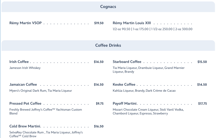 …cognacs, coffee drinks…