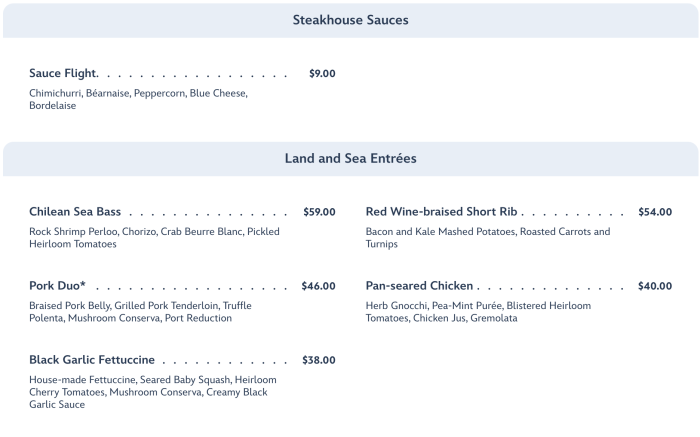 …steakhouse sauces along with Land & Sea entrees…