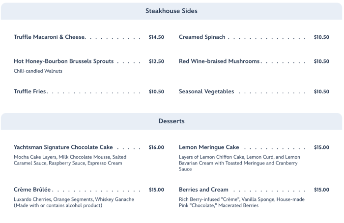 Yachtsman Steakhouse is a New England-style steakhouse where you can savor premium steaks, fresh seafood, and more. It’s also one of Disney World’s signature dining restaurants, which means you can expect a more sophisticated vibe to the restaurant’s menu offerings, decor, theming, and service while you dine.