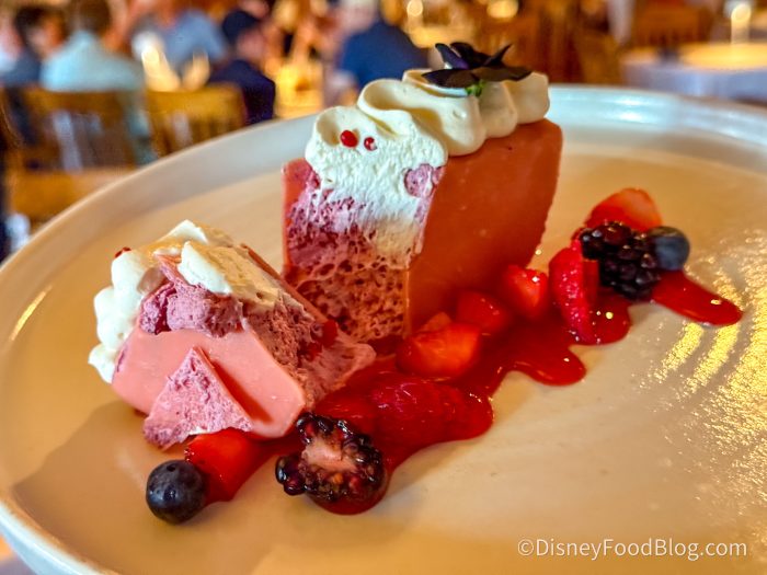 Again, did we think we were going to become obsessed with a vegan berry dessert at a steakhouse? No, we didn’t, but we are thrilled. It’s made with vegan milk chocolate, and the mousse was whipped to create peaks and holes, making it incredibly fluffy.