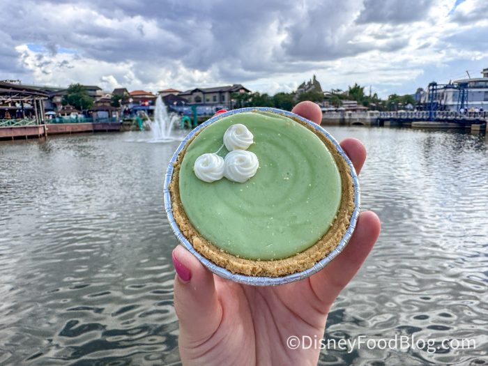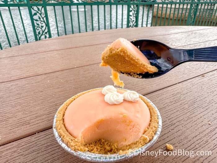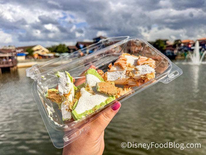 Next, we tried the Orange Cream S’more and the Key Lime S’more for $6.99 each. They are actually similar to another Disney s’more, the PBJ s’more, from Zuri’s Sweet Shop in Animal Kingdom. These are like regular s’mores on the inside, with a graham cracker and marshmallow. The outside is a white chocolate layering flavored to either orange cream or key lime.