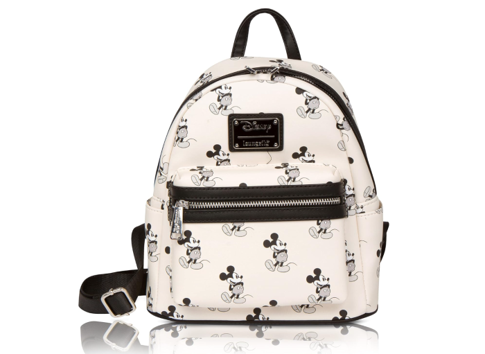 If you want something straightforward and simple, check out this Loungefly Disney Mickey Mouse Mini Backpack. The black and white design will go with just about any outfit or any theme park. It has the traditional two zipper pockets and adjustable straps in its design, as well as slip pockets on the side.