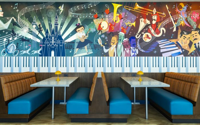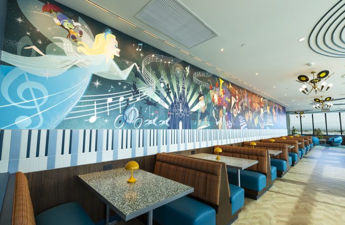 The light fixtures resemble records, a piano spans the entire wall, and the mural above it features some of our favorite Disney characters. Sleeping Beauty Castle is silhouetted in the middle, and around it, we spotted the Blue Fairy, Jiminy Cricket, Peter Pan, Wendy, Michael, and John, as well as The Dapper Dans and the Sherman Brothers, among many others.
