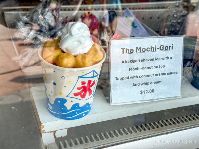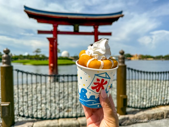 Over in the Japan Pavilion, you’ll find Kabuki Cafe, which is a small stand that serves up shave ice and other special treats. We heard about a new special treat that just landed on the menu, combining two of our favorite treats, so we knew we had to try it. As it turns out, this new treat is everything we didn’t know we’d been waiting for!