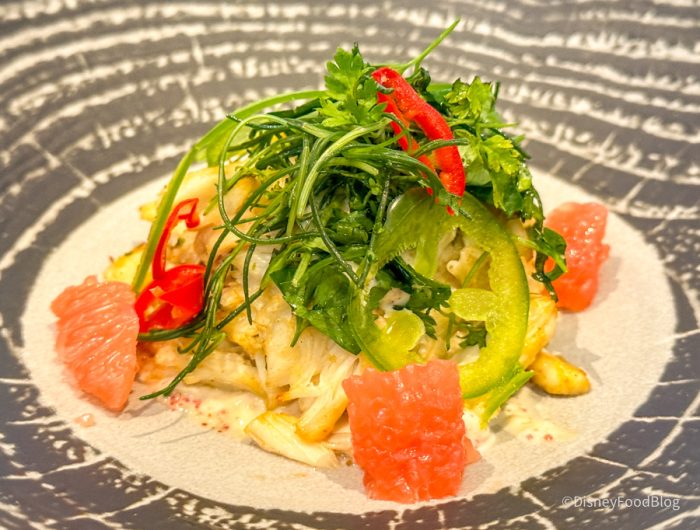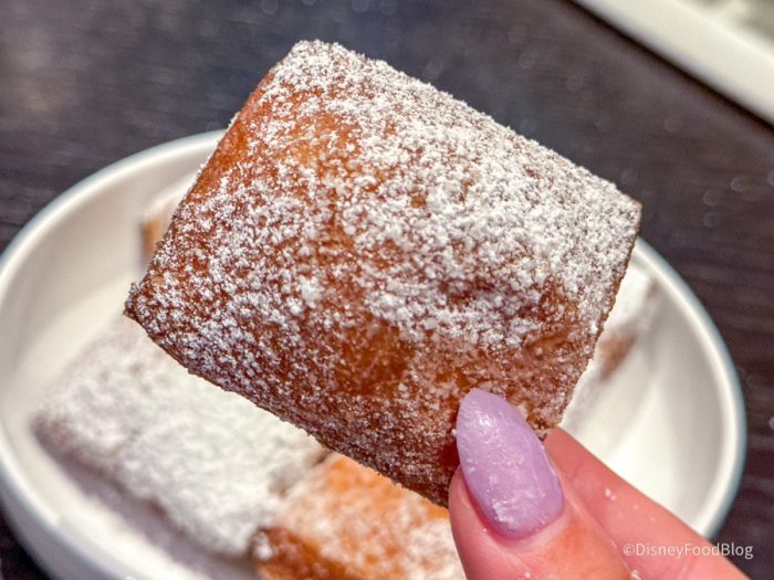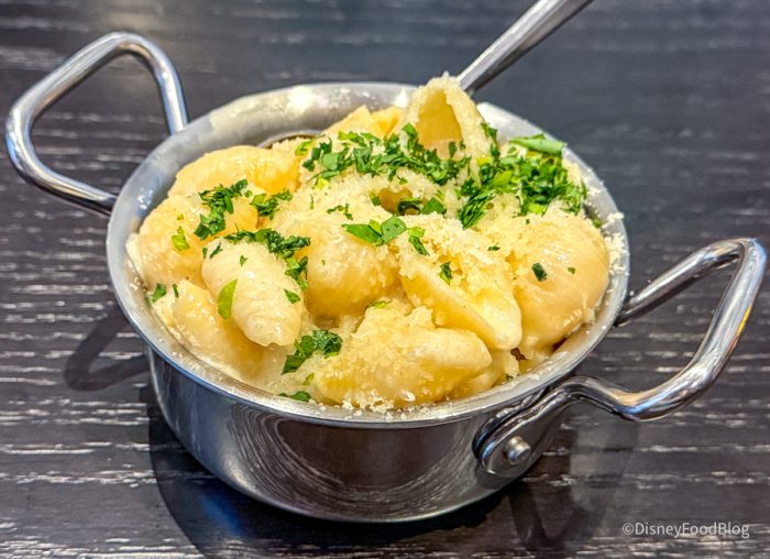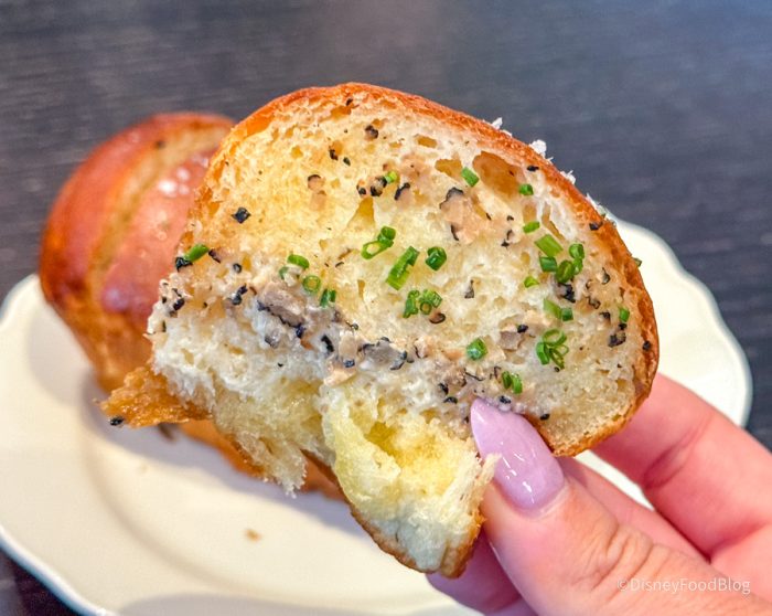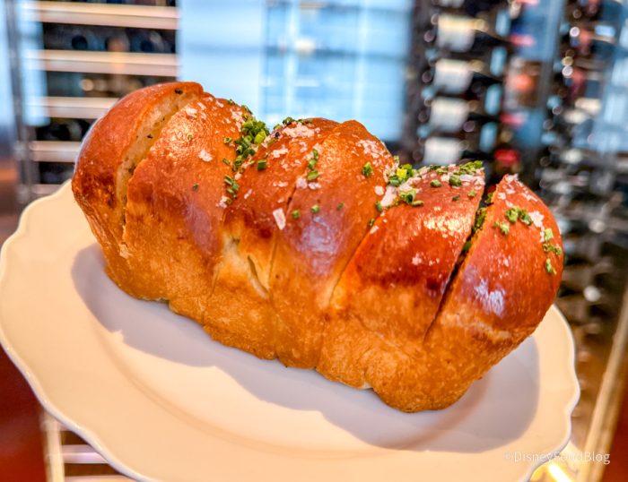 This was maybe some of the best bread we’ve ever had at Disney World, and we’ve had LOTS of bread at Disney World over the years. We don’t love the idea of paying $14 for bread, but after eating this — we would do it again in a heartbeat. They’re basically Parker House rolls with black salt, herbs, and truffle butter soaked into the bread. One of our reporters ate four pieces of this and had zero regrets. Imagine a super elevated garlic knot — it was SO good.