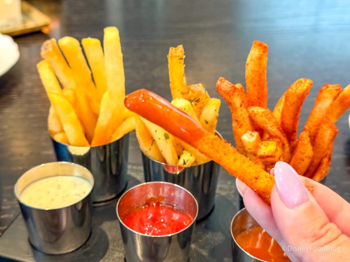 There were Truffle Aioli fries with a truffle aioli to dip in, regular Herbed Fries with regular ketchup, and then Paprika fries with the housemade bourbon barbecue sauce. All three of these were awesome. Our favorite was the truffle aioli — we completely killed them. The flavor is super strong, but not so strong that you wouldn’t want the aioli with it. Both were just kind of buttery, and the umami was incredibly intense, yet delicious. The herbed fries were perfectly seasoned with the sweetness of ketchup, a classic fry experience. Then, the paprika fries were really tasty on their own, and the barbecue sauce here is smoky and has a little bit of kick to it. It’s almost like a mesquite with just a little bit of kick, where it’s not spicy, but it’s enough to add some interest.