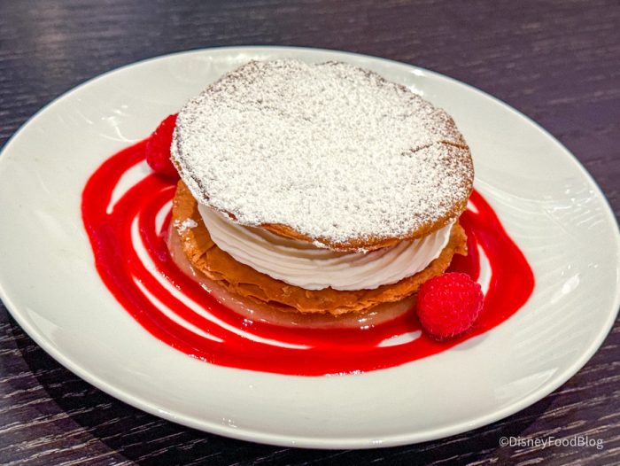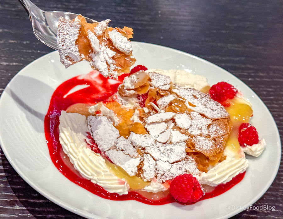 We loved this! They said this was a nod to Florida flavors, of course. They were very clear that we needed to crush it to get everything to mix together. The key lime was tart enough to cause that zing in your jaw, but not so tart as to make you pucker, and it was balanced very well by the classic sweetness of the raspberry sauce and fresh raspberry. We sometimes find Napoleon textures a little off-putting, but this one was done very well with the thin, crunchy pastry on top and the lady fingers supporting it. A bit had a good combo of creaminess, crunch, and soft pastry.