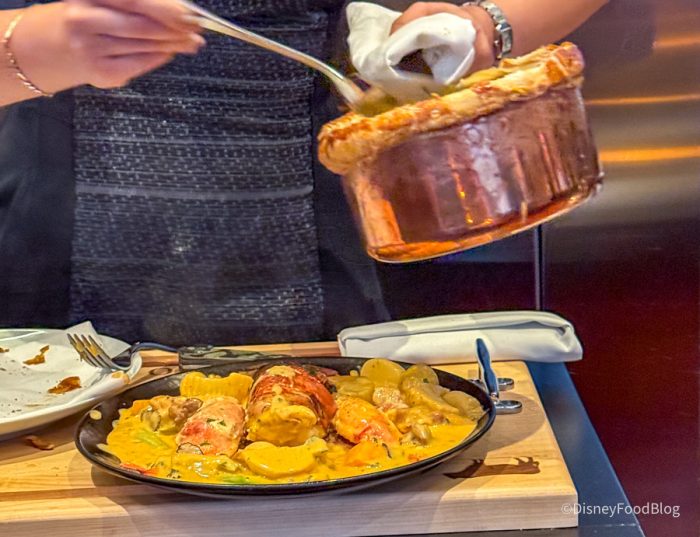 They roll up to your table with this massive pot pie dish, carve the top off perfectly, and then reconstruct the lobster tail and claws on top of the crust, then ladle on the veggies and pot pie filling all around it. Flavor-wise wise this was a TON of lobster — especially for one person. There were beautiful, huge, meaty pieces that pulled apart easily. The filling of the pie was basically like a rich buttery sauce that infused all of the veggies with that flavor and paired perfectly with the lobster. Add the surprisingly durable crust of the pie, and you have a luscious, beautiful dish.
