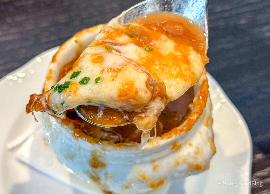 Next up, we ordered the Onion Soup Gratin with caramelized onions, a trio of cheeses, and a garlic baguette, which is available for $15.