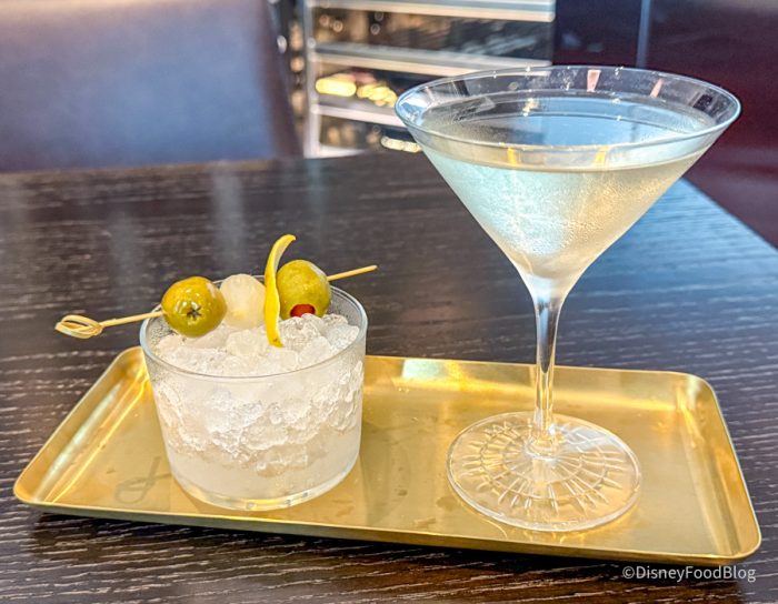 This was truly an incredible martini. There was no bite or burn at all from the liquor, but you could still taste the flavor of the liquor. It was extremely balanced, and that citrus essence is definitely present and aromatic. It was so drinkable despite tasting extremely liquor-forward, one of the best straight martinis we think we’ve ever had from that perspective. We also loved the presentation of martini accoutrements on the side, including a regular olive, a bleu cheese-stuffed olive, a lemon rind for a twist, and a pearl onion.
