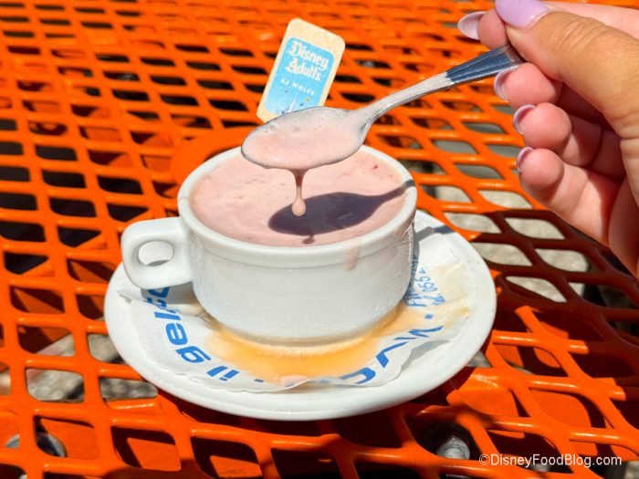 Alright, back to our review. We visited Vivoli il Gelato to indulge in the Tipsy Teacup for $10.75. This is a strawberry “affogato” with peach bellini prosecco in the center. Note that “affogato” is in quotation marks because it’s not a true affogato with espresso, but the concept is the same. It’s like a fun little twist just for us Disney fans! It’s also served in an adorable teacup.