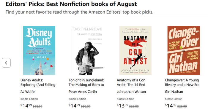 That’s right! We were perusing Amazon (as one does) and discovered that the “Editors’ Picks: Best Nonfiction books of August” includes Disney Adults! How exciting is that?!?!?!