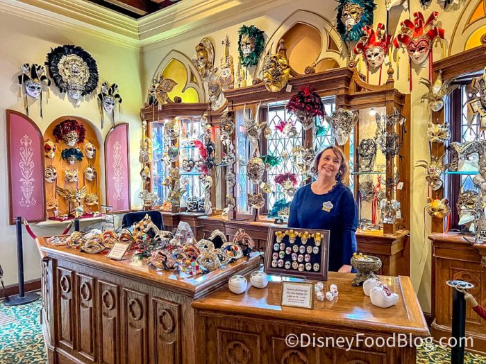But that wasn’t my only splurge of the day. In a strange turn of events, I found myself invited to a masquerade ball (yes, really), so I needed a mask for the event. That’s not the sort of thing you can pick up at Target, but lucky for me, EPCOT has a store FULL of masks! I headed over to La Gemma Elegante with one mission: obtain a mask fit for a ball.