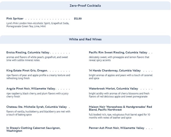 There is also a zero-proof cocktail, as well as a selection of white and red wines.