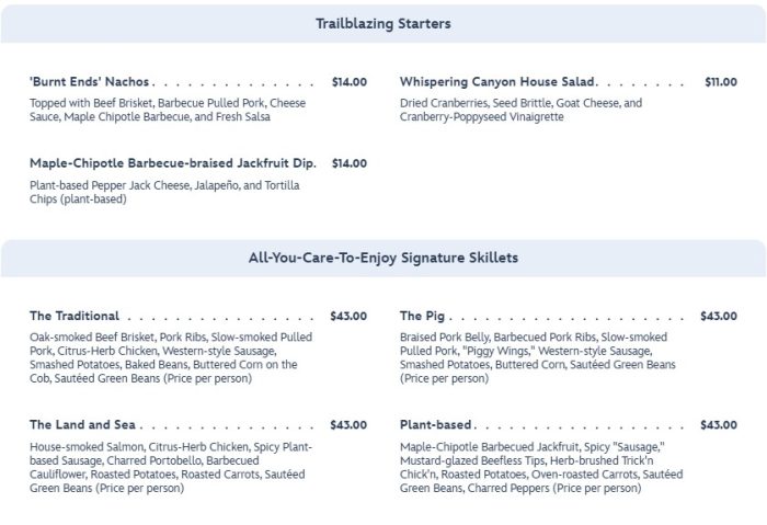 You can choose from three different starters, including the ‘Burnt End’ Nachos, the Whispering Canyon House Salad, and the Maple-Chipotle Barbecue-braised Jackfruit Dip. Whispering Canyon is known for its all-you-care-to-enjoy skillets, and you can choose from four different options. Each skillet offers a selection of food, and you can get more of anything on your skillet until you are full — or let’s be honest, absolutely stuffed!
