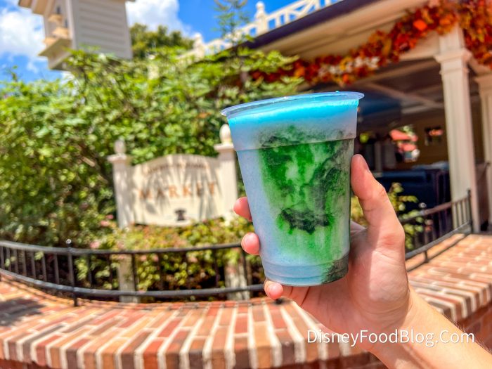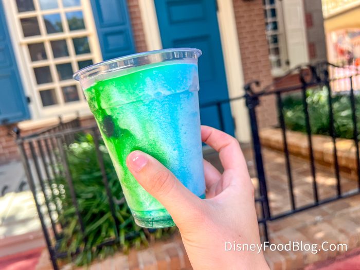 Finally, we made the short trek to Liberty Square Market to grab the Magic Potion Slushy for $6.29. This item is made with a Fanta Blue Raspberry slush and mixed with yuzu. This new drink actually changes color from blue to green when you stir it!