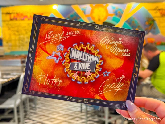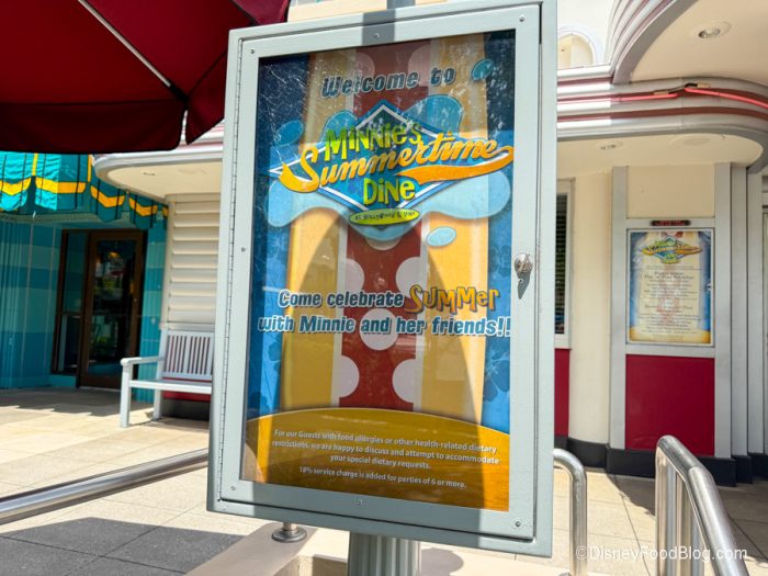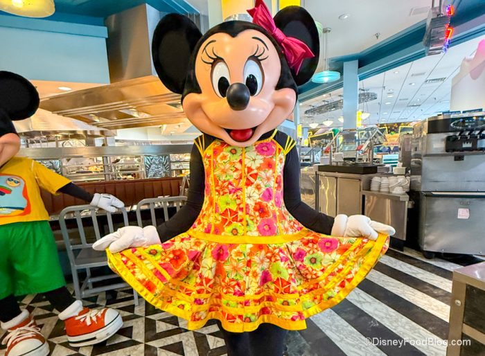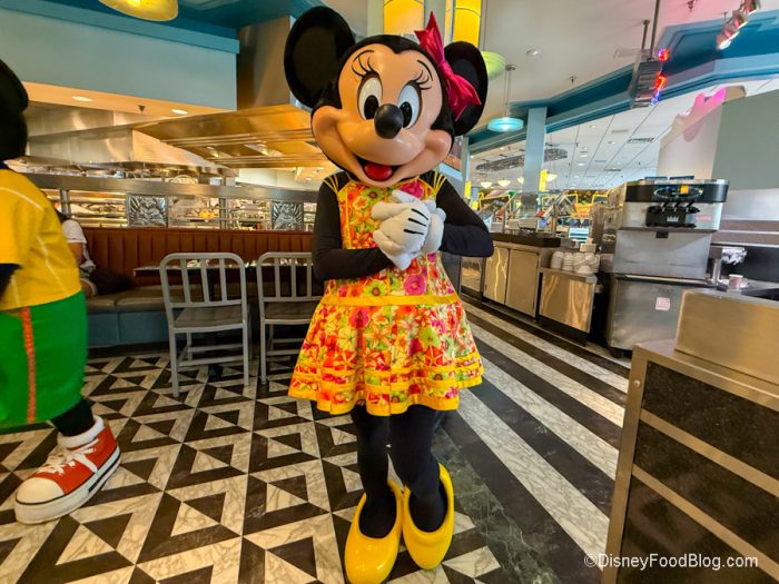 Minnie’s Seasonal Dine has taken over Hollywood & Vine as it changes throughout the year. Not only will the inside theming be notably different, but each of the characters, like Minnie, Goofy, Pluto, and Mickey, will be sporting different outfits depending on the time of the year you’re visiting. The theme when we visited was Summertime Dine. As soon as you walk into the restaurant, there’s a fun summer background or a photo op.