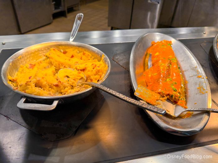As we mentioned briefly before, the main meal here is served as a buffet. Adults dining here for lunch or dinner can expect to pay $63, and children ages 3-9 are priced at $42. Disney World lists a partial menu on its website for everything that’s offered, and we want to point out that some things can change without notice based on availability. Here’s a look at the main menu offerings!