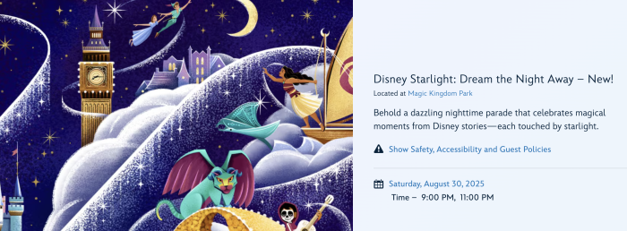 From now through August 30th, Disney Starlight will continue to have showtimes at 9 PM and 11 PM.
