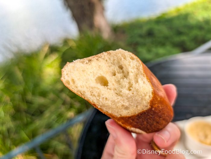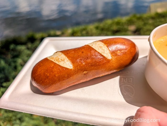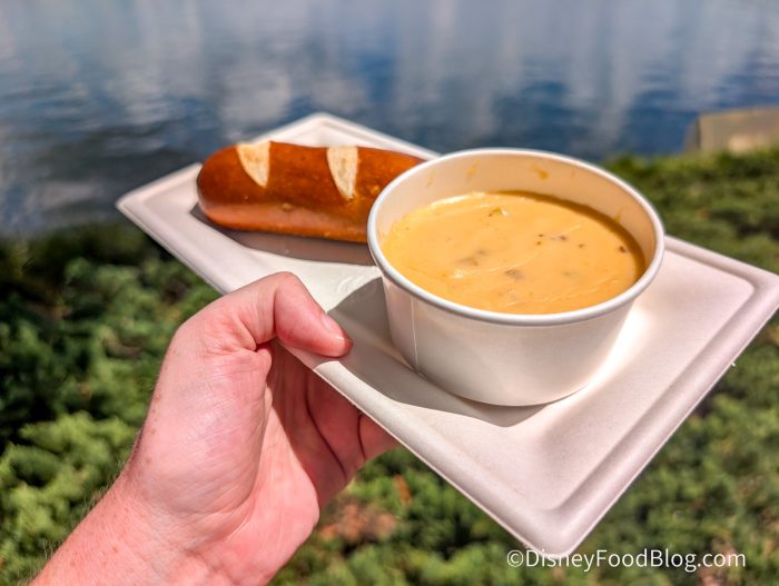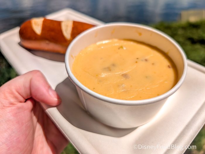This is a best of the fest item for sure! It’s super cheesy and super creamy. The bacon flavor disperses throughout the entire soup, which is delicious. The cheese is a very good beer cheese, and the pretzel bread is soft and fluffy!