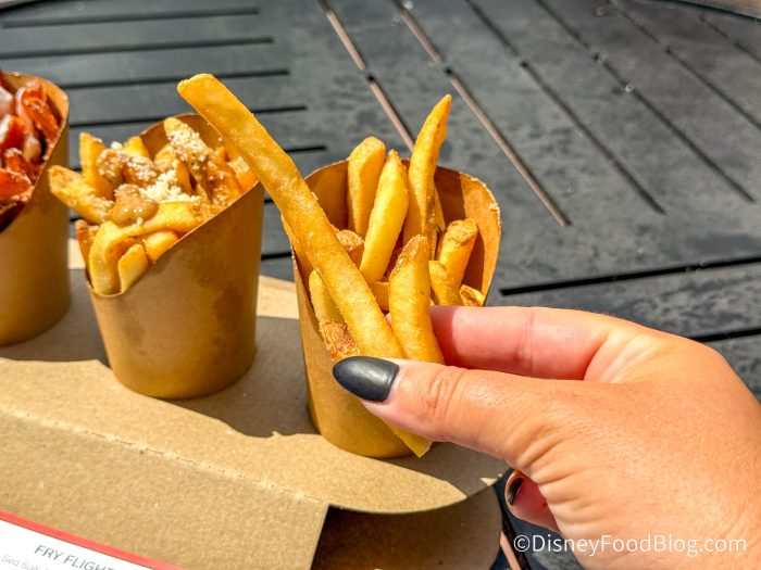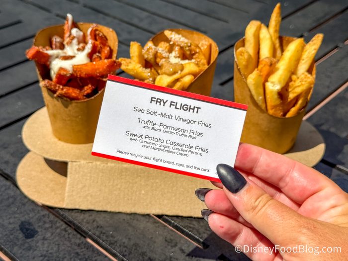 The famous Fry Flight features Truffle-Parmesan Fries, Sea Salt-Malt Vinegar Fries, and Sweet Potato Casserole Fries. Altogether, the Flight is $8.
