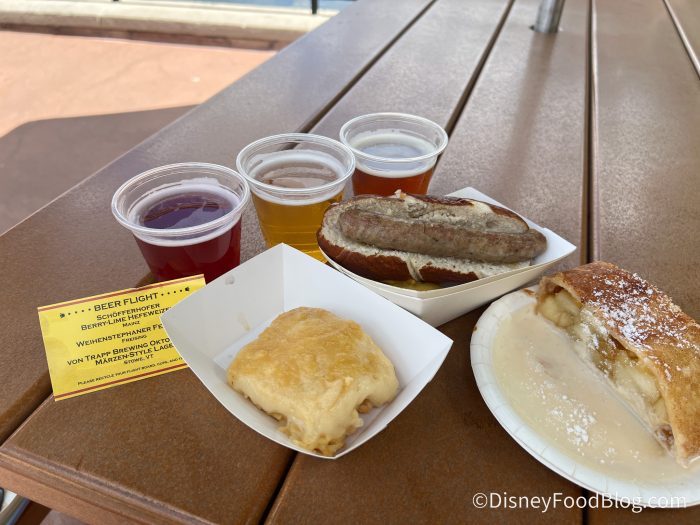 But don’t worry — as festival experts (we go every year, multiple times a week throughout the festival), we know where the best tables are located. In the Germany Pavilion, there’s a nice seating area with picnic tables and benches that usually has plenty of spots open.