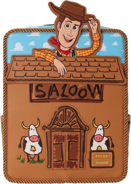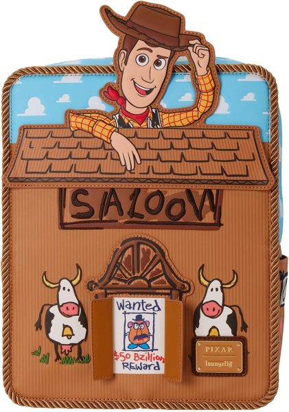 Hey, howdy hey, take a look at this 30th Anniversary Woody Mini Loungefly Backpack! This mini backpack looks like Woody’s saloon, made from the cardboard box Andy put together. You’ll find Andy’s handwriting labeling the “Saloon” on the front, and the “Bank” and “Hotel” on the side pockets. The bag also features real rope details and cowboy faux leather.