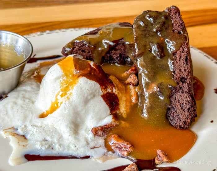 This is incredible — it’s a giant brownie that’s been cut in half. It’s fudgy, but it does still have a fluffy cake consistency — it’s not too dense but is so, so chocolatey. It’s moist and bouncy, and the vanilla ice cream served on the side is an excellent addition. The caramel sauce, chocolate drizzle, and candied pecans are also a nice touch. The pecans add a welcome crunch, and they’re lightly toasted, so they add a roasted nuttiness.