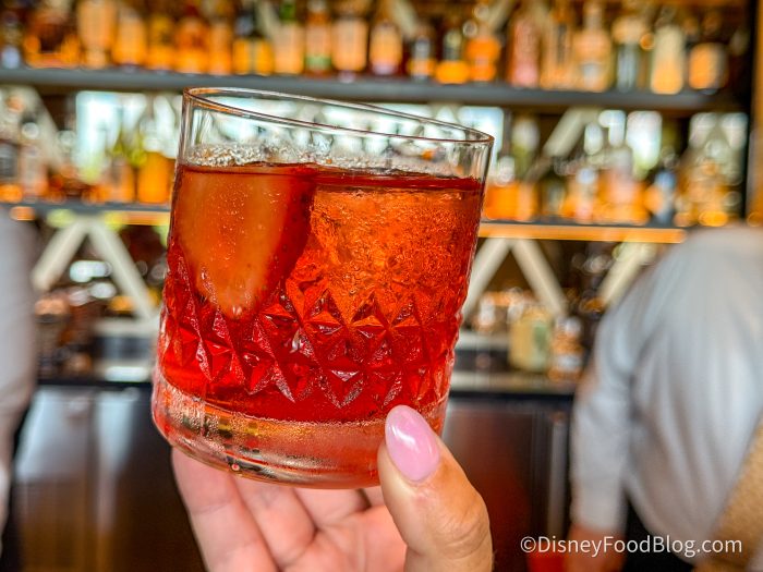 The standout drink at the lounge for us was the $28 Brown Butter Old Fashioned! The drink is made with Woodford Reserve Double Oaked Bourbon, brown butter, maple, and Hella Cocktail Co. Mexican chocolate bitters. This one was the clear winner for us, as it tasted like brown butter with a heavy kick from the alcohol. It was so brown butter-y that you could feel the butter on your lips.