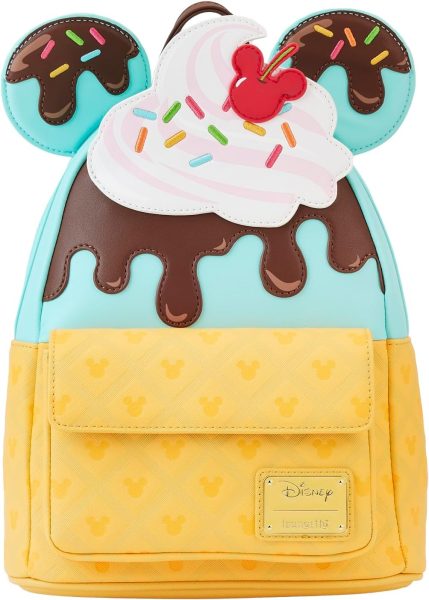 This bag looks good enough to eat. With chocolate syrup dripping down, rainbow sprinkles, and a Mickey-shaped cherry on top, it’s basically the dessert version of a Loungefly. Minnie’s ears double as scoops of ice cream, making it both clever and ridiculously adorable. Inside, you’ll even find sprinkle-patterned lining to keep the theme going.