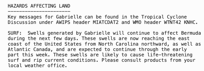 The storm is expected to continue its north-northwest track throughout Monday, followed by an increased northeastward or east-northeastward motion on Tuesday. The center of Hurricane Gabrielle is expected to pass east of Bermuda on Monday night.