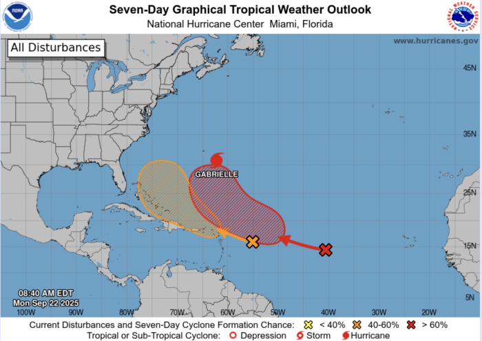 Hurricane Gabrielle’s sustained winds have increased to near 120 mph, which officially makes it a Category 3 hurricane. The estimated minimum central pressure of the storm is 957 mb. Hurricane-force winds extend outward up to 30 miles from the center, and tropical-storm-force winds extend outward up to 140 miles.