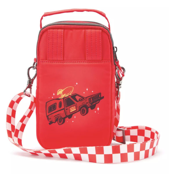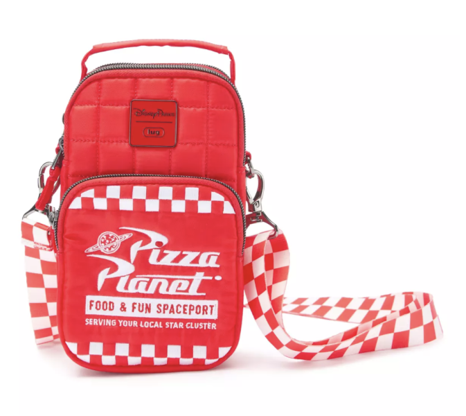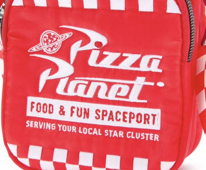 We are freaking out over the fact that a Pizza Planet Lug Bag now exists and is online! The bag itself is that iconic red color from the film, but the crossbody strap is white and red checkered, which matches part of the pattern on the bag’s front pocket, where the Pizza Planet logo is. The logo reads “Pizza Planet” and “Food & Fun Spaceport Serving Your Local Star Cluster.”