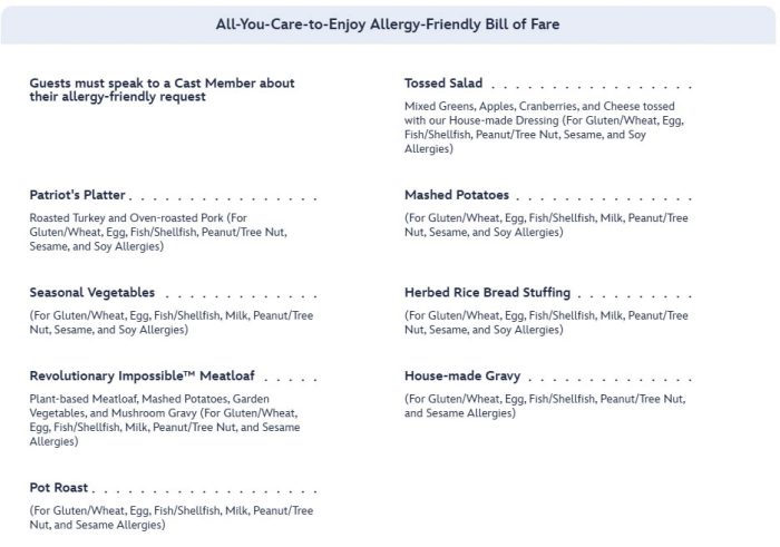 We also tried the allergy-friendly Bill of Fare with most of the same items, although the dressing is an Herbed Rice Bread Stuffing. However, they make adjustments so there’s no gluten on the plate. As you can see, Disney puts little purple-colored markers on the allergy-friendly foods.
