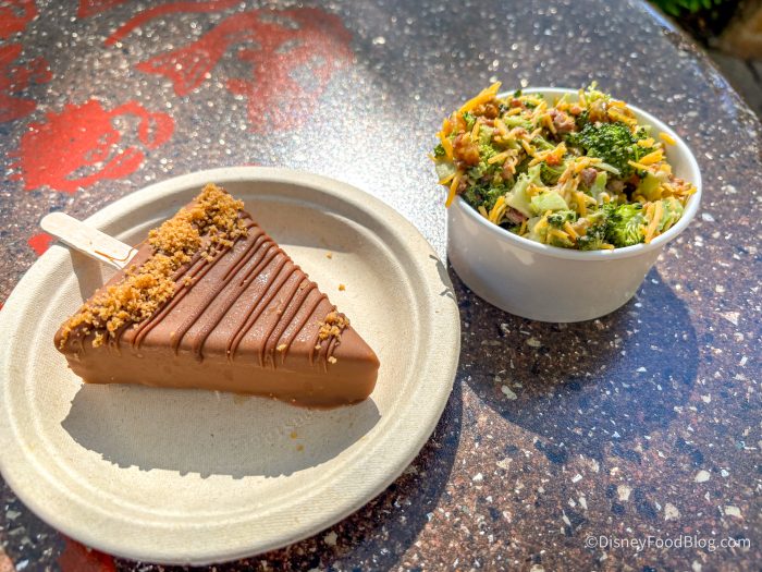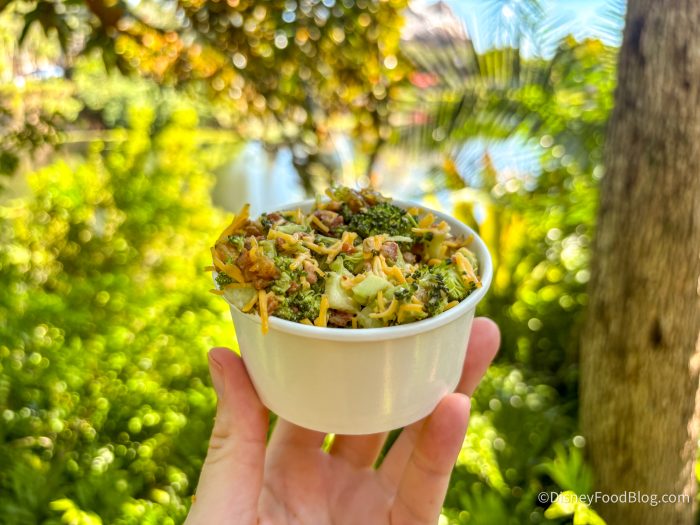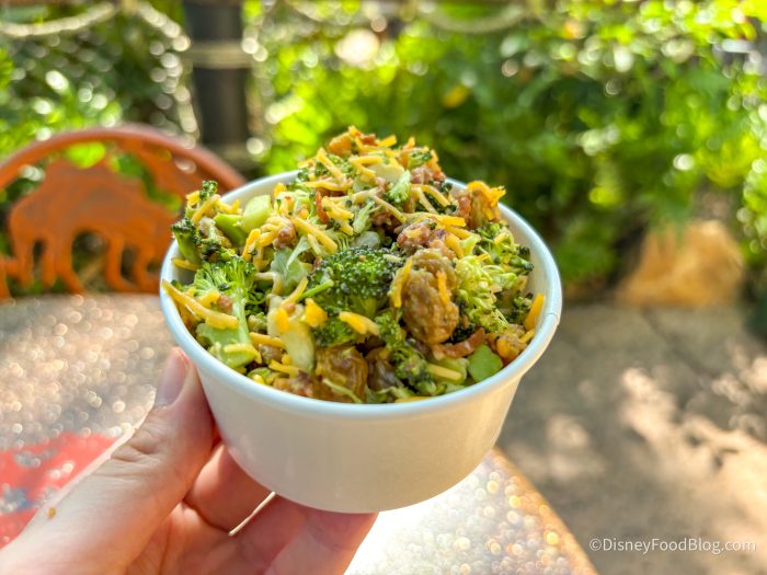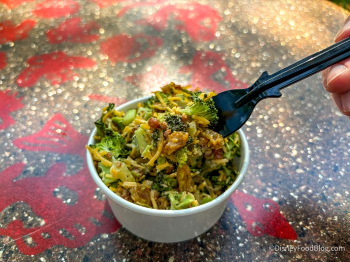 The broccoli here is slightly cooked, where it still has a bite, but you also aren’t eating raw broccoli, which we enjoyed. The bacon is in little pieces mixed throughout the salad, and it adds a bite of smokiness, meatiness, and crunch. We really like the sweetness from the golden raisins, as well as the coleslaw-like dressing. You don’t see many vegetables in Disney theme parks, so this is a rare win!