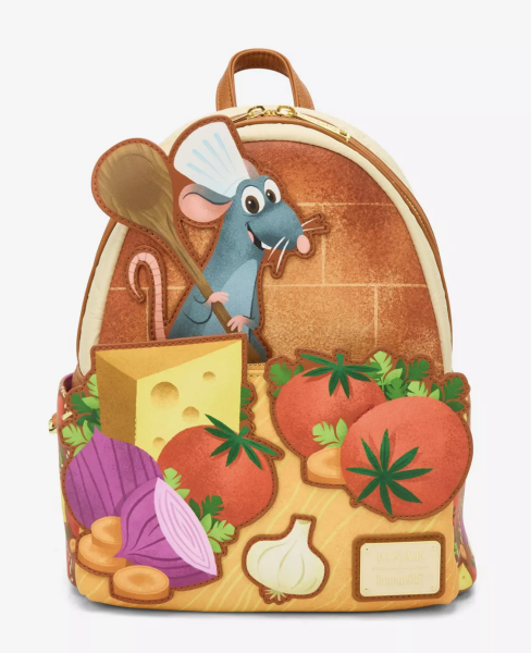 For those who love the story of Ratatouille, you can’t miss the adorable new Ratatouille Remy Food Mini Backpack. The bag looks like it’s against a brick background, which is very unique, and Remy stands above some of the ingredients needed to make his next dish (which also acts as the hidden front pocket).