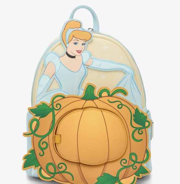 The Cinderella Ballgown Pumpkin Mini Backpack showcases Cinderella in her gorgeous ballgown at the top, but the front pocket is made up of the iconic pumpkin that turned into a carriage, and inside is a little picture of none other than Jaq and Gus.
