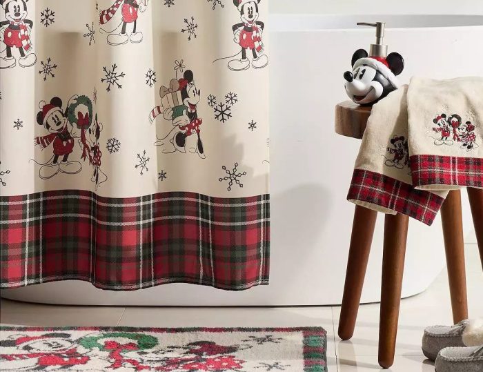 Bring some Disney holiday cheer to your bathroom with this Mickey and Minnie towel set that’s part of a fun bath collection. Both towels feature Mickey and Minnie with a holiday wreath with a buffalo plaid pattern at the bottom.