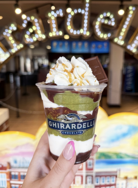 If you want a Dubai Chocolate flavor right here, right now, head on over to Ghirardelli in Disney Springs to try the Dubai Style Chocolate Sundae! This was released just over two months ago and features smooth vanilla ice cream, rich handmade hot fudge, creamy pistachio butter, toasted kataifi mixed with white chocolate, and sea salt. Then, it’s topped with whipped cream, caramel drizzle, and a Ghirardelli Milk Chocolate Caramel SQUARE.