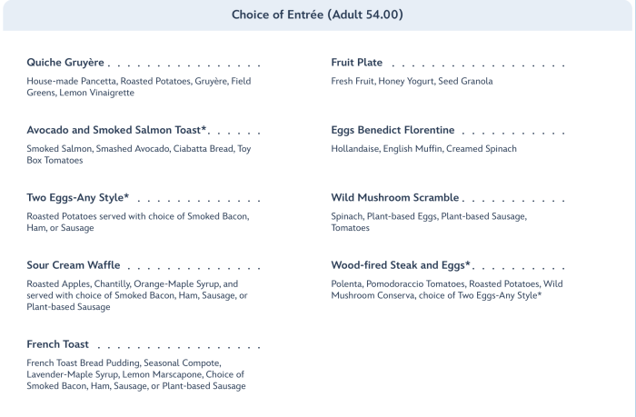 It’s breakfast offering features a choice of entrees for adults costing $54…