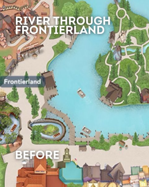 The updated layout shows the water hugging the edge of the land before winding straight into the heart of Piston Peak. This creates a seamless transition between the old and new sections of the park.