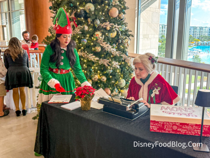 At this spot, you can find tons of special moments like meeting Santa and Mrs. Claus. Their Evening Meet & Greets are happening from December 19th to December 21st for anyone staying at the resort. Mrs. Claus and her elf, Jingle, were set up at the entrance so you and your kiddos can write letters to Santa! This was such a sweet way to kick off our visit.