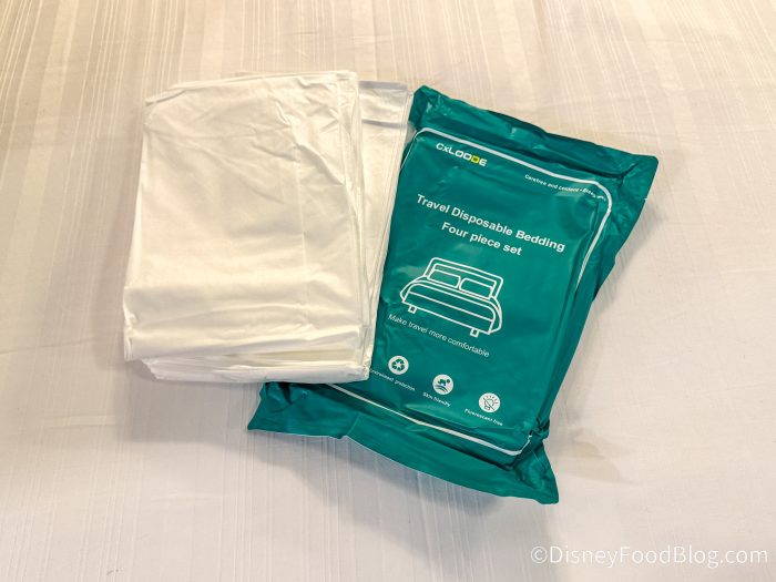 Okay, so you might think you need disposable bed sheets for your hotel room, and Amazon and internet trends might suggest you do, but we’re not so sure. This set comes with two pillow shams, a sheet cover, a quilt/comforter cover, two disposable face cloths, and two disposable bath towels. Yes, these are sanitary, but we really just didn’t feel like we needed them. The only thing we could even stand against our skin was the face cloth and the bath towel, but the face cloth doesn’t lather very well.