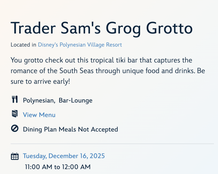 Guests looking to dine at Trader Sam’s Grog Grotto can now experience this unique spot from 11 AM to 12 AM, whereas you’d previously only be able to visit between 3 PM and 12 AM.